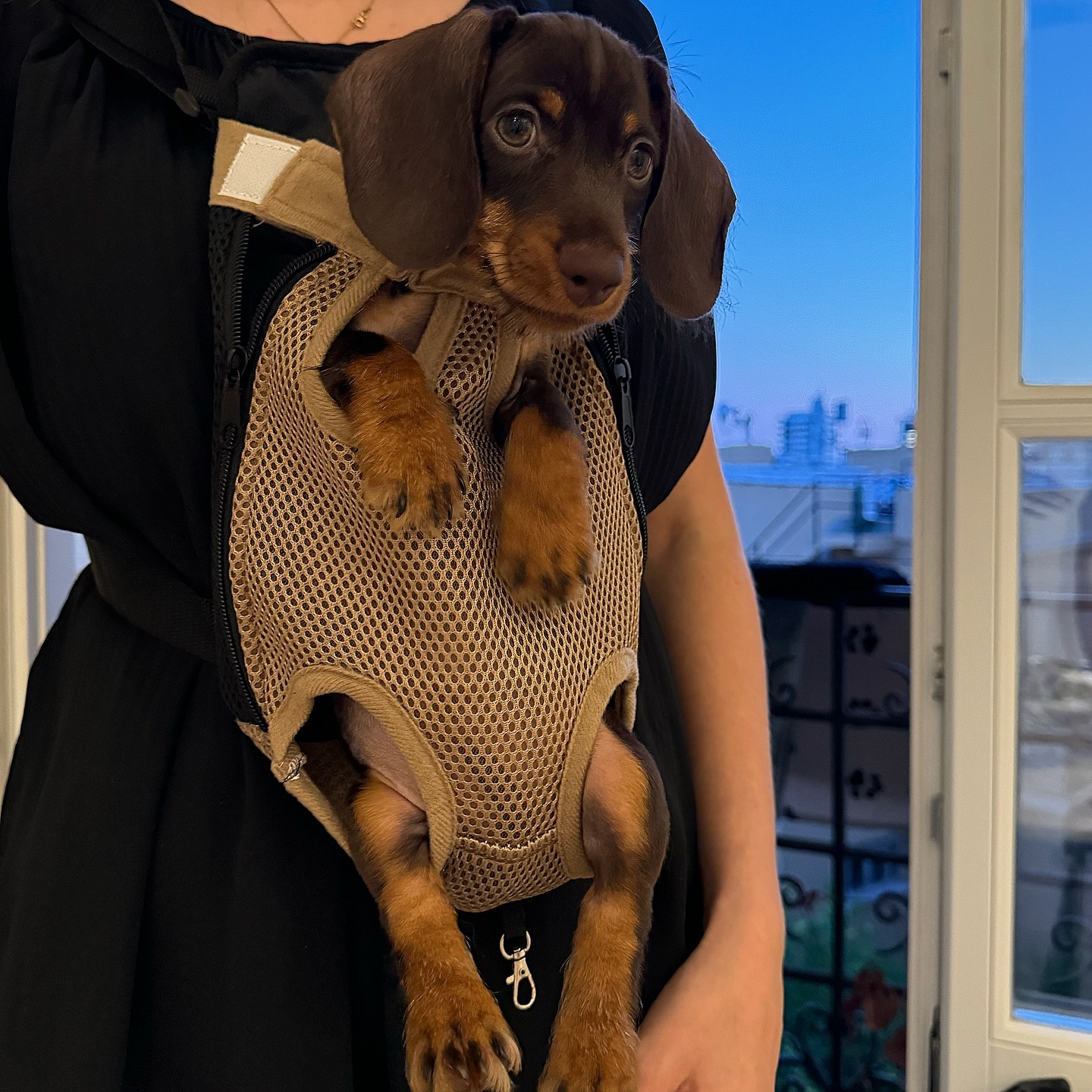 "¡Increíble! We are so happy with our smooth-haired mini, Salsa. The communication was fantastic, and despite the distance, the flight nanny service they arranged was flawless. Salsa arrived happy and ready to play. She has a gorgeous, shiny coat and the most fun-loving energy. She’s already the star of our neighborhood."